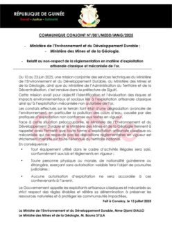 Face à cette situation préoccupante, le Ministère de l’Environnement et du Développement Durable et le Ministère des Mines et de la Géologie tiennent à rappeler avec fermeté que toute forme d’exploitation artisanale classique ou mécanisée qui ne respecte pas les dispositions réglementaires en vigueur est strictement interdite sur toute l’étendue du territoire national.