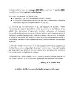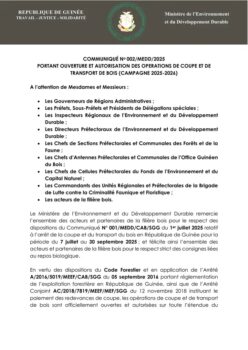 Conakry, le 3 octobre 2025 – Le Ministère de l’Environnement et du Développement Durable (MEDD) a officiellement annoncé, par le biais du communiqué n°002/MEDD/2025, l’ouverture de la campagne nationale de coupe et de transport de bois pour la période 2025-2026.